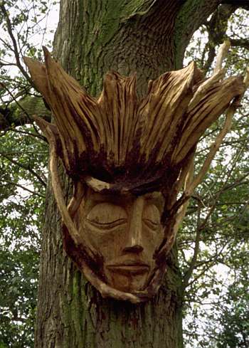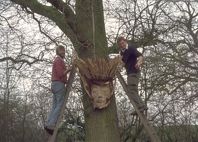The head was carved from oak and sweet chestnut from local woodland and pegged together. It was designed for a glade used for storytelling and educational workshops. It is suspended on an oak tree and now ivy is creeping around the face creating the illusion that the head is actually part of the trunk. | ||