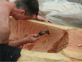 The project involved professional woodsmen, boat designers, canoeists, painters and professional and volunteer carvers and painters. It took place at Trinity Buoy Wharf in East London through the generosity of Urban Space Management and Wakehurst Place and Kew Gardens. The project drew enthusiastic crowds fascinated by the tools techniques and the tactile and visual power of the emerging vessel. However the creation of the canoe was only the first part of the the process. The canoe was about to be embedded in a matrix of festivals, symbolic landings and cultural exchanges as it journeys along the waterways. The journey and events, actual and symbolic, will touch the lives of many individuals and communities associated with the Lee Valley Regional Park and its riparian boroughs in a dynamic and creative way. |